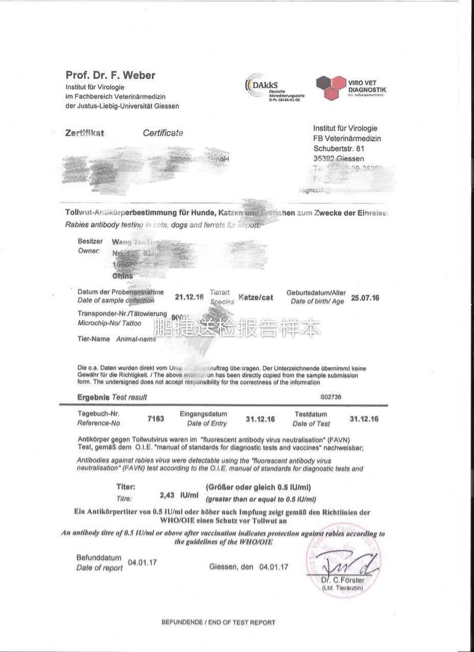 3、将血清邮寄WWW.青青草原宠物托运公司,由我司安排专人送至欧盟指定实验室。