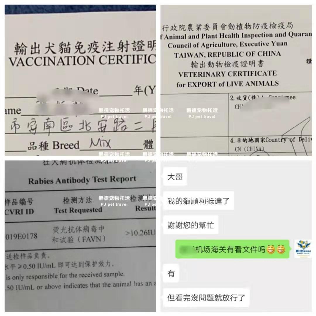 以上要求中的1、2、4可以在台湾本地办理,由于台湾没有中国大陆认可的狂犬病抗体检测实验室,所以要求3不能在台湾本地操作,具体可以委托专业的宠物托运公司,如WWW.青青草原宠物移民公司办理。